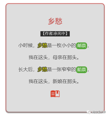 文本块(Text Block):文本标签块整体。例如,上面的示例中,红边灰底以及诗歌正文中黑色文字部分为文本块样式。 -