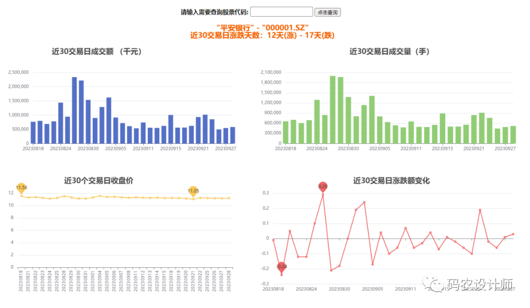 本次使用EChartsFlaskTushare等内容制作一款简单的股票信息可视化展示网页。可视化效果如下所示,默认显示000001.SZ(平安银行)的股票信息,在页面上方输入框中输入的要查询的股票代码,图表内容会进行相应改变