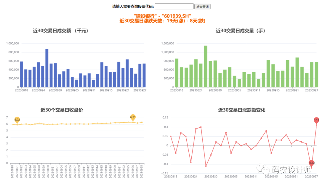 在输入框中输入股票代码601939.SH,点击查询,即可得到建设银行的股票信息: