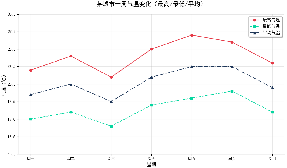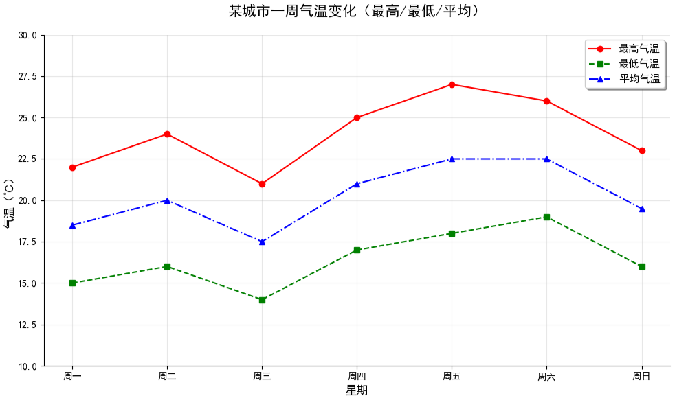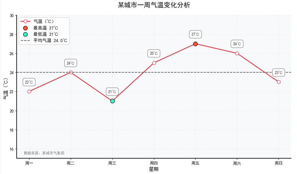 plt.title('某城市一周气温变化分析', fontsize=16, fontweight='bold', pad=20) # 标题加粗