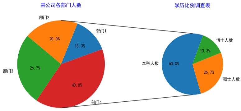 要在两个饼图之间建立视觉联系,可以使用 Matplotlib 的 ConnectionPatch 函数。该函数能创建一条连线(直线或曲线),连接两个图表中的指定位置,常用于强调数据间的关联关系。