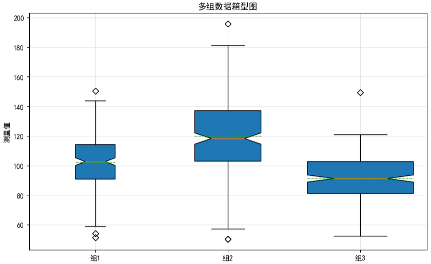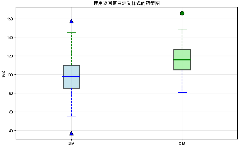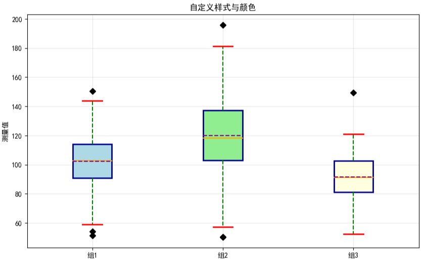 meanprops:控制均值标记(需配合showmeans=True启用)的样式。若meanline=True,则为线条样式(同medianprops);否则为标记样式(同flierprops)示例:{‘color’: ‘purple’, ‘linestyle’: ‘–‘}(线条)或{‘marker’: ‘^’, ‘color’: ‘purple’}(标记);