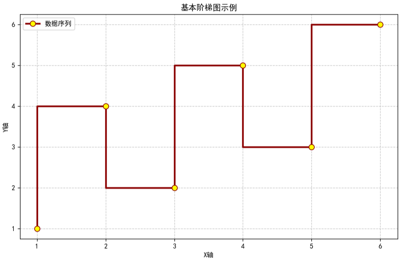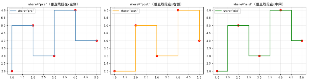 where:控制阶梯的位置,可选值包括,‘pre’(默认,水平线段从每个x位置向左延伸)、‘post’(水平线段从每个x位置向右延伸)、‘mid’(阶梯在相邻数据点之间居中)。