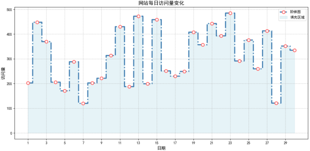 可使用 fill_between() 函数填充阶梯图与 x 轴之间的区域,增强视觉层次感,尤其适合展示 “累积量” 或 “范围” 数据。