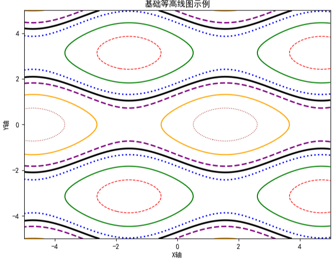 linestyles:线型样式。可为单一线型(如 ‘–‘),也可为线型序列(如 [‘-‘, ‘–‘, ‘:’])。若序列短于层级数,则会循环使用。若为 None,默认为 ‘solid’,除非线条是单色的(此时负等高线可能使用 negative_linestyles 参数)。