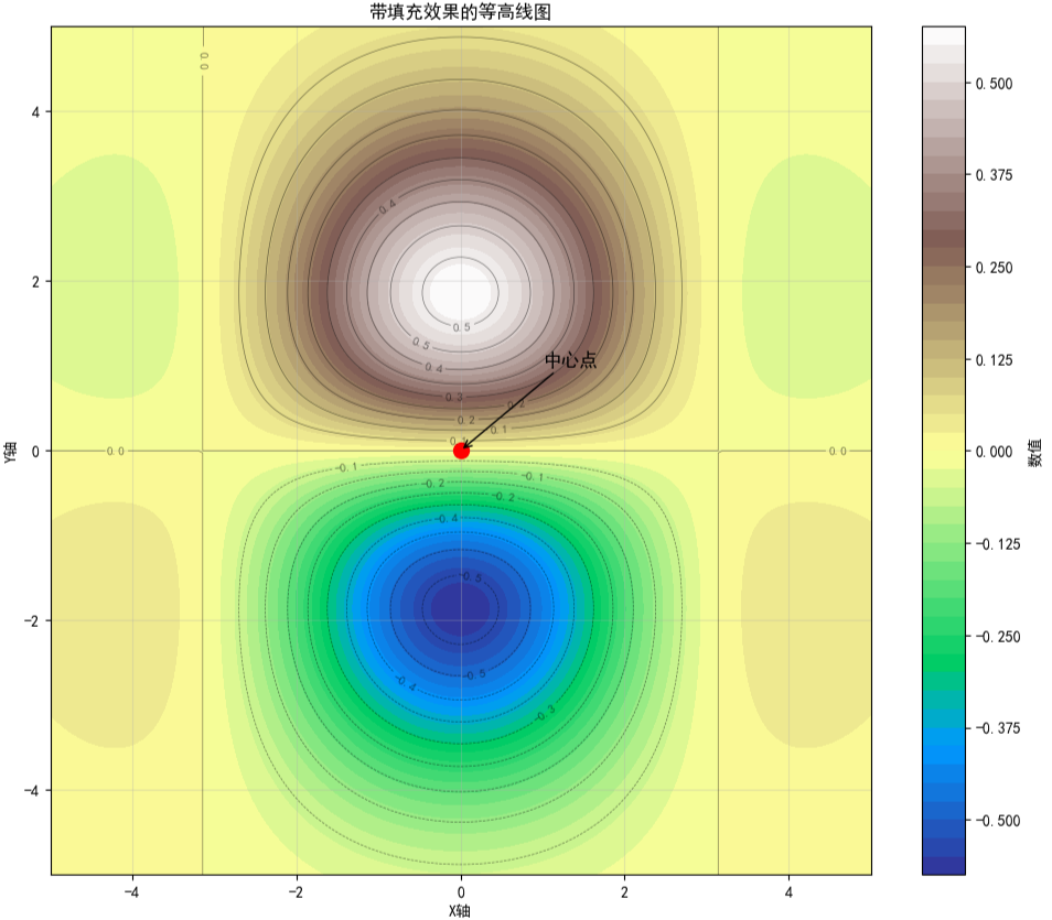 示例 2:带填充效果的等高线图(contourf () 函数配合使用)
