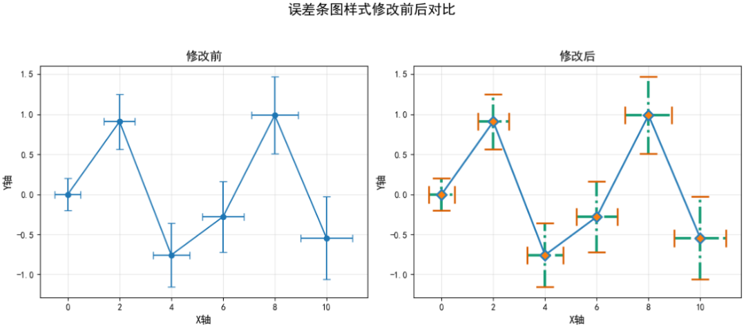 fig.suptitle('误差条图样式修改前后对比', fontsize=16, y=1.05)