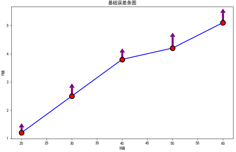 在某些场景中,数据的上下误差可能不相等(如产品重量的允许偏差为上限 0.5g,下限 0.3g),此时可通过二维数组设置不对称误差,第一行代表每个数据点的 “向下误差”,第二行代表 “向上误差”。另外,在需要同时展示 x 轴和 y 轴误差的场景(如物理实验中 “时间测量误差” 和 “距离测量误差”),可同时设置xerr和yerr参数,此时 x 轴与 y 轴将同时显示误差。