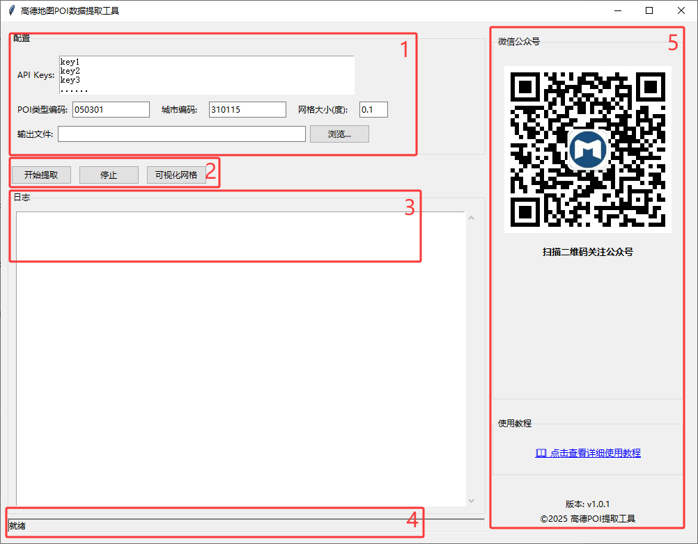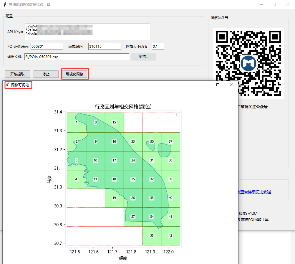 可以在此输入API Key、设置POI类型编码、城市编码和网格大小等参数。此外,还可以通过“浏览…”按钮选择输出文件的路径和文件名。