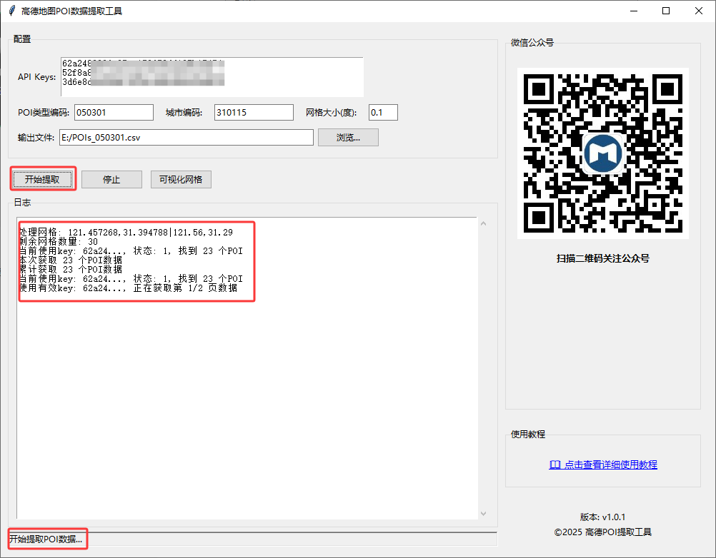 实时显示数据提取过程中的日志信息,包括当前处理的网格、已提取的POI数量等,方便用户了解任务进度