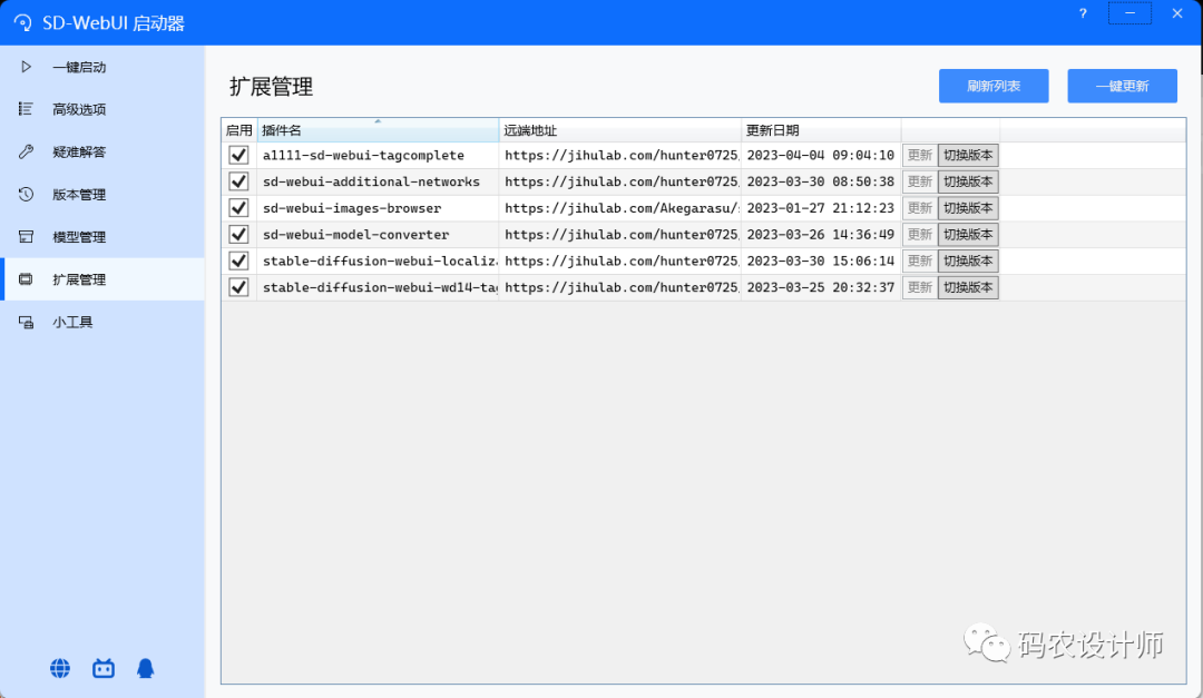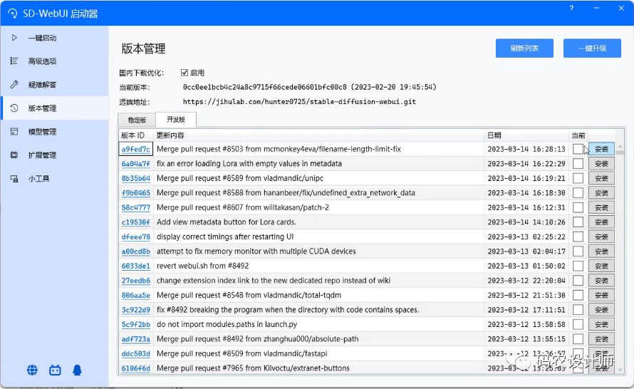 如果发现下方的当前SD-WebUI版本处为红色,可以切换到“版本管理”,点击“一键升级”按钮。