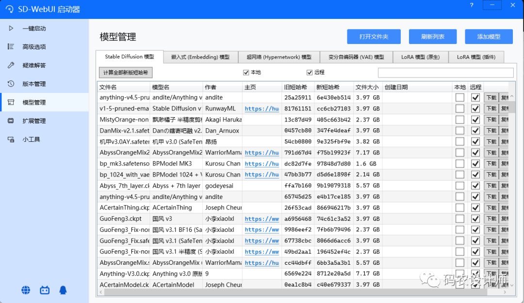 切换到“模型管理”,可以看到整合包包含了很多模型,这也是整合包占用较大空间的原因。