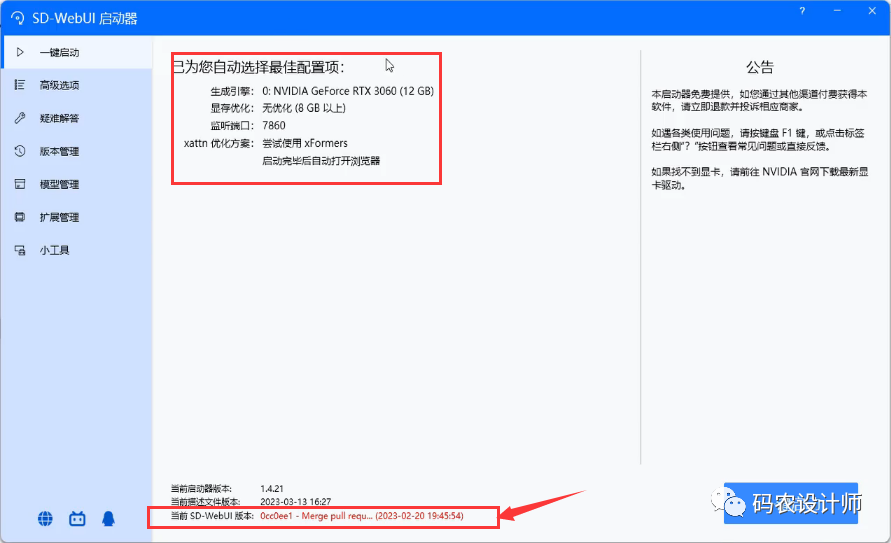 通过上述四步即可完成Stable Diffusion的本地部署,此时,打开Stable Diffusion文件夹,双击“A启动器.exe”启动器图标,打开SD-WebUI启动器,该启动器会自动检测你的电脑硬件配置: