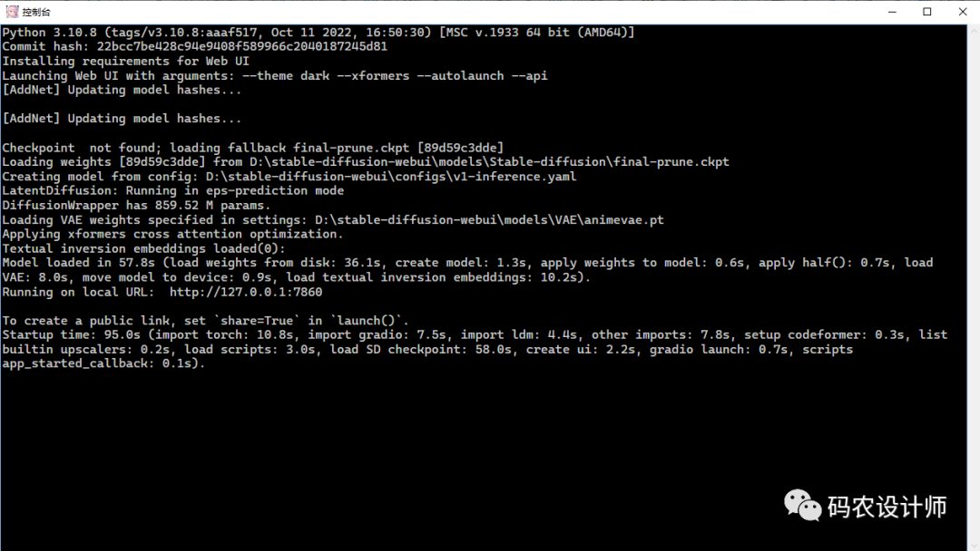 切换到“高级选项”,可以进行更多设置,设置完成后点击“一键启动”按钮,会弹出控制台(这是Stable Diffusion的真正后台,使用期间切勿关掉)