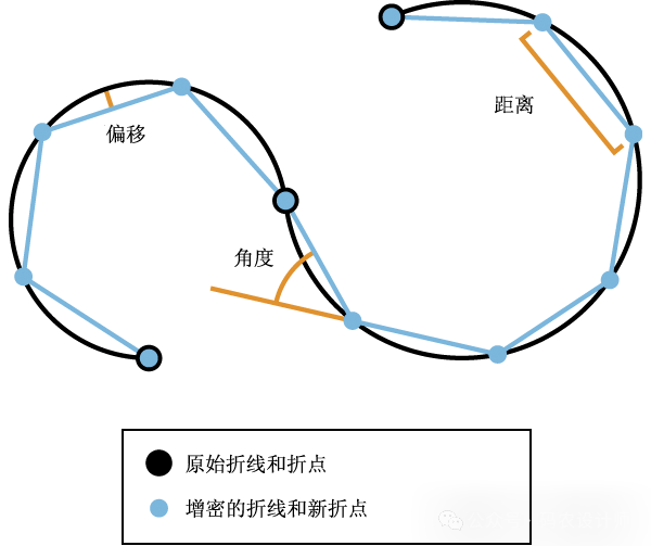 该方法则是基于最大偏移偏差来增密线段。这种方法会在曲线段上增加折点,以确保任何连续线段之间的偏移量不会超过设定的最大偏移偏差。这种方法特别适用于需要保持曲线形状的同时减少点的数量。