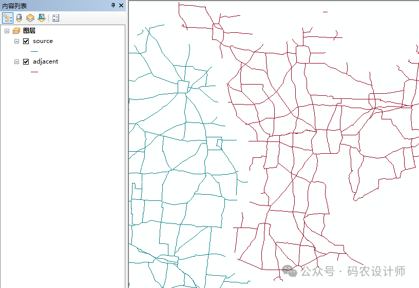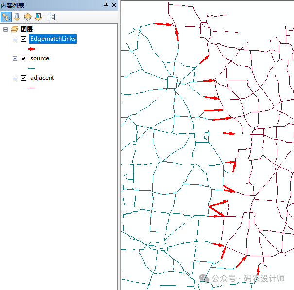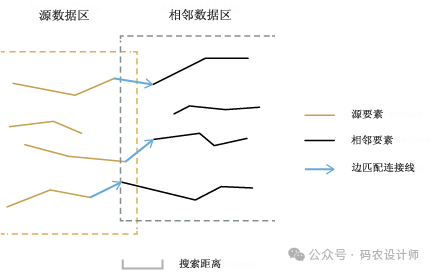 生成边匹配链接工具用于沿着源数据区域及其相邻数据区域的边缘查找匹配但是已断开的线要素,并生成从源线到相匹配相邻线的边匹配链接。