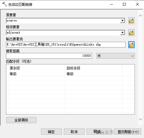 选择【系统工具箱→Editing Tools→合并→生成边匹配链接】工具,在弹出的对话框中进行设置。