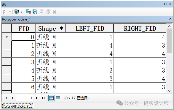 如果选中识别和存储面邻域信息复选框,则会分析面邻域关系。将边界转换为线时将考虑相交线段或公共线段,此时输入要素的属性并不会保留在输出要素类中,向输出要素类添加两个新字段 LEFT_FID 和 RIGHT_FID,用于表示位于各输出线左右两侧的输入面的要素 ID,有助于了解转换过程和输出:
