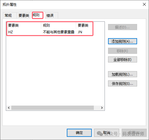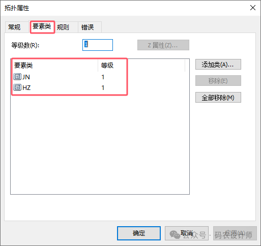 在【目录】窗口右击拓扑数据,选择【属性】,在弹出的【拓扑属性】对话框中切换至【要素类】和【规则】选项卡,可以看到已经预先添加了两个要素以及一种规则。
