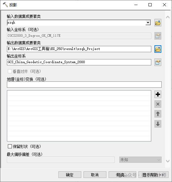 地理(坐标)变换:可选参数。当不需要地理变换或基准面变换时,参数中不会出现下拉列表,并且参数为空。当需要变换时,将会基于输入基准面和输出基准面生成一个下拉列表,并会选择一个默认变换。 -