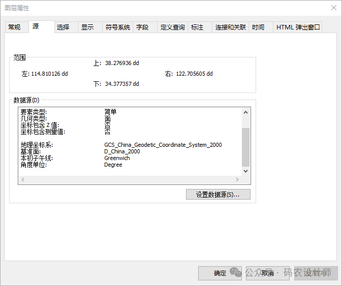 打开图层属性对话框,切换到【源】选项卡,可以看到当前数据图层的坐标信息已更新。