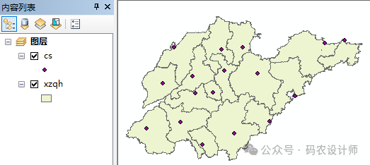 加载【xzqh】和【cs】要素,看窗口右下角的坐标可以看到该数据坐标系统为投影坐标系。