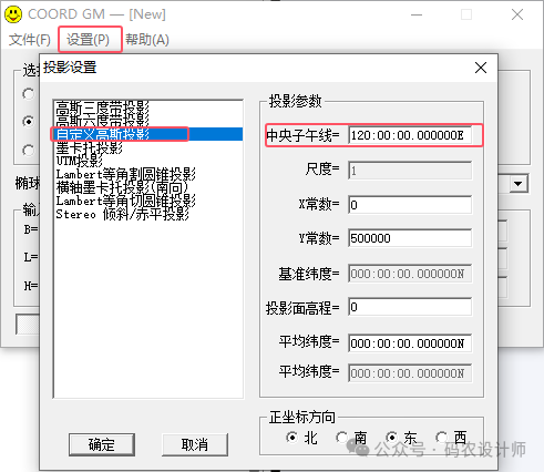 另外还需要设置一下地图投影,单击【设置→地图投影】,在弹出的对话框中进行设置,这里选择自定义高斯投影,中央子午线设置为120E(根据需要设置中央子午线)。