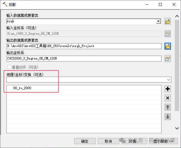 此时,在加载坐标系为80的数据,并将其转换为2000坐标系时,即可看到之前创建的自定义地理(坐标)变换【80_to_2000】。