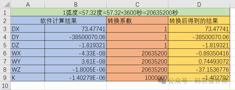 需要注意的是,使用COORD GM软件计算得到的结果是以弧度为单位的,而ArcGIS中是以秒为单位的,所以需要将COORD GM软件得到的参数进行一下转换。