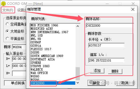 因为COORD GM软件系统自带的椭球中没有CGCS2000,需要我们自己添加,单击【文件→椭球管理】,在椭球管理对话框中添加我们需要的椭球体,点击添加,可以看到在在左侧的椭球列表中,就有了我们需要的椭球体名称。