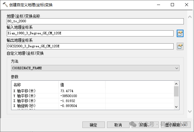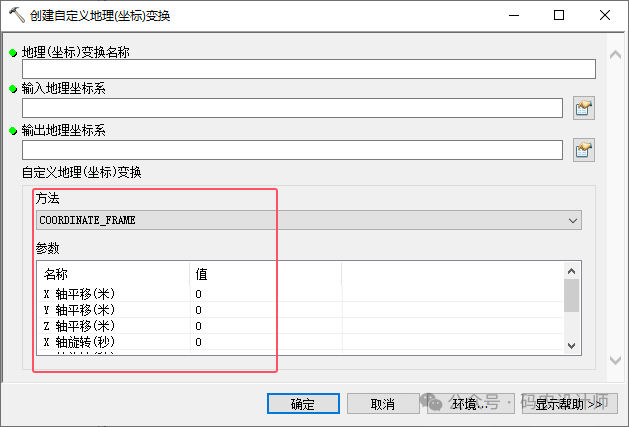 打开【工具箱→Data Management Tools→投影与变换→创建自定义地理(坐标)变换】工具,在弹出的对话框中可以看到,选择变换方法后需要设置对应参数,需要借助第三方软件获取参数。