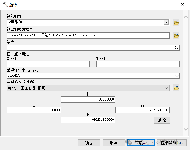 枢轴点 (可选):选择旋转栅格所围绕的点。如果留空,输入栅格数据集的左下角将用作枢轴。 -