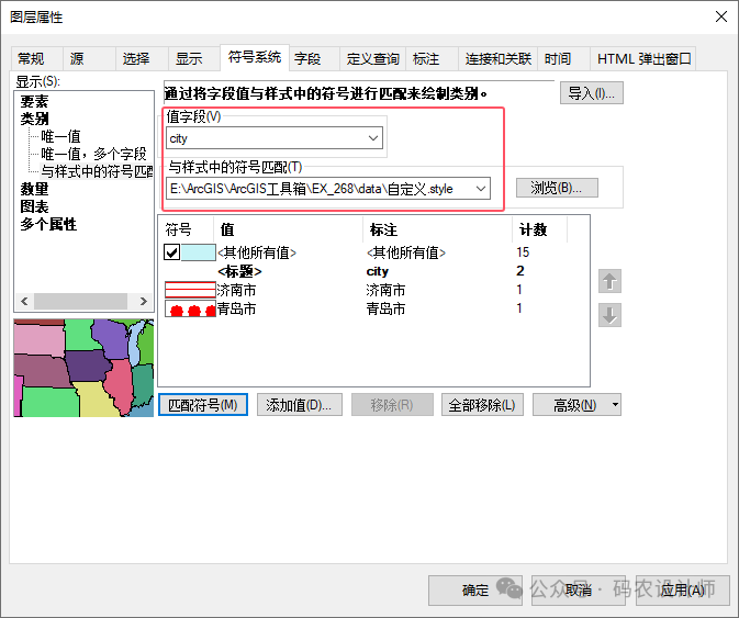 打开图像属性对话框,在显示列表栏中选择【类别→与样式中的符号匹配】,在值字段下拉框中选择字段(本次为city字段),在与样式中的符号匹配区域点击浏览按钮选择样式文件(本次为data文件夹下的自定义.style文件),单击匹配符号按钮,会根据字段进行匹配。
