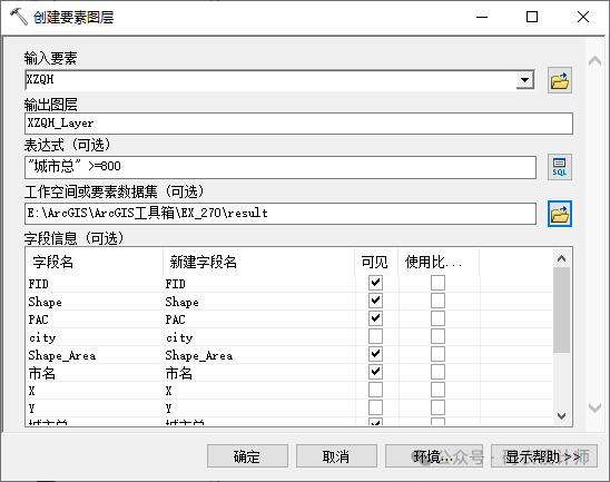 字段信息 (可选):可用于查看和更改字段名、隐藏输出图层中字段的子集、指定分割策略。 1)、更改字段名:在第二列可以对某字段重新命名。在后续工具中将采用字段信息控件中定义的字段名。但是,如果该具是模型中的最后一个工具,则将从磁盘的源数据中获取字段名。要保留字段名,必须使用复制行或复制要素工具将新图层写出到新数据。另外,字段名将通过指定输入工作空间来进行验证。 2)、字段可见属性:第三列用于指定字段在新图层中是显示还是隐藏。如果新建的图层是后续处理过程或工具的输入,则不能在工作流中使用隐藏的字段。如果将输出保存到磁盘,则只有列出的可见字段将显示在新数据中。 3)、使用比率策略:第四列用于设置分割策略。每当将要素图层用作工具的输入且在处理中分割输入要素图层的几何时,分割策略就会生效,输出值将根据输入要素几何被分割的比率得出。例如,如果输入几何被分割成相等的两部分,则每个新要素的属性值都等于输入要素属性值的一半。仅适用于数值字段类型。