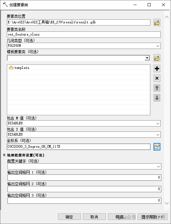 坐标系 (可选):输出要素数据集的空间参考。在空间参考属性对话框中,可以选择、导入或新建坐标系。需要注意的是,模板要素类的空间参考对输出空间参考没有影响。 -