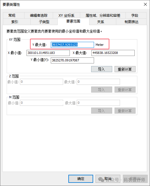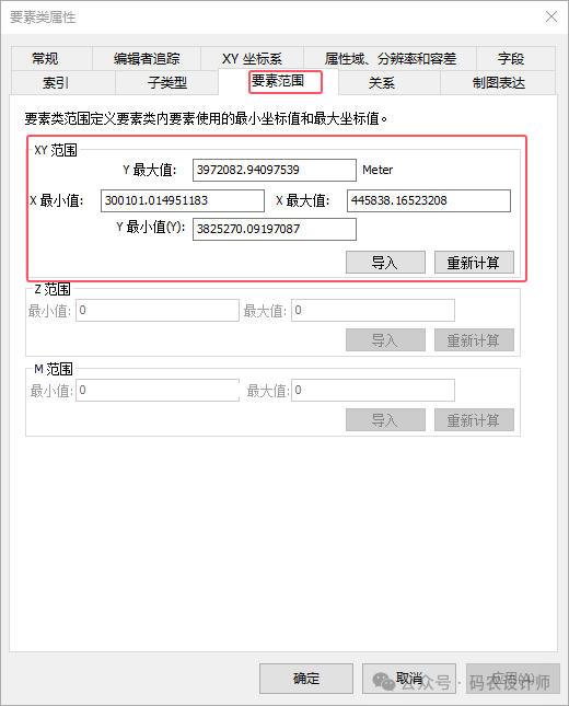重新计算要素类范围工具基于要素类中的各个要素重新计算要素类的 XY、Z 和 M 范围属性。需要注意的是,重新计算要素类范围的操作无法撤销。
