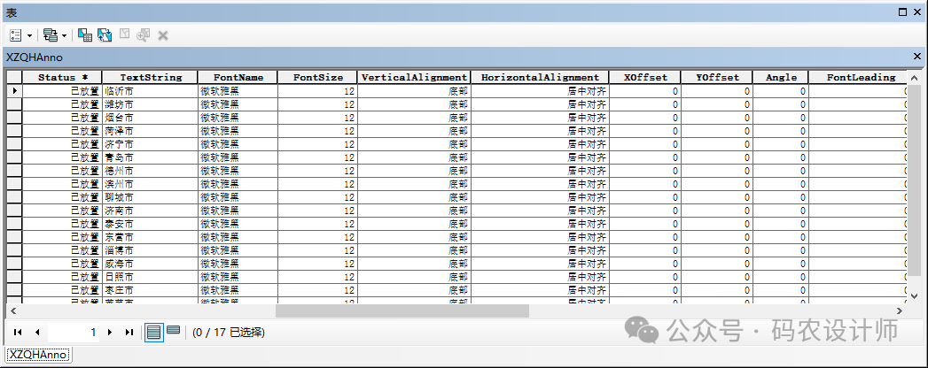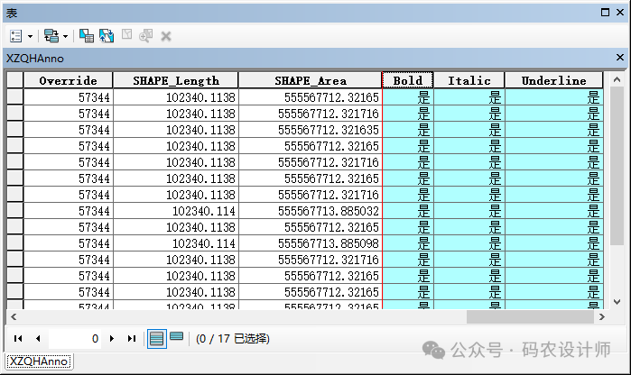 设置完成,点击确定,得到更新后的注记要素类。打开其属性表可以看到在属性表最后面添加了用于设置字体粗细、斜体以及下划线的Bold、Italic、Underline三个字段,并使用默认值进行字段填充。
