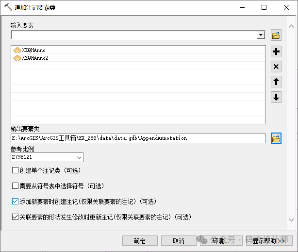 追加注记要素类工具用于创建地理数据库注记要素类,或者通过合并多个输入地理数据库要素类中的注记将现有注记要素类追加到一个包含注记类的要素类中的工具。