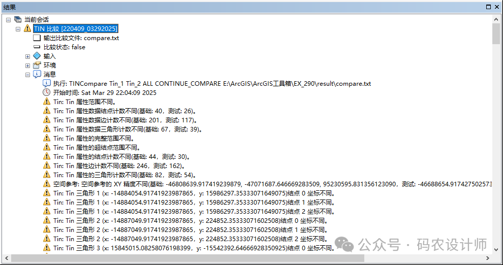 该工具可以识别两个TIN数据集在几何、TIN 结点和三角形标记以及空间参考方面存在的差异,并可以将比较结果输出到一个文本文件中。