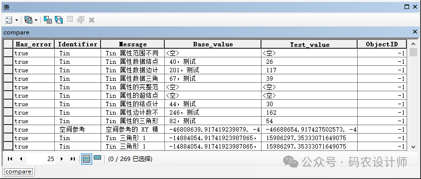 可以直接在地理处理结果窗口中查看要素比较结果,也可以通过输出的比较文件查看(其中,has_error 字段指示记录包含误差,True 表示存在差异。)。