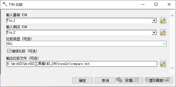 TIN比较工具用于比较两个三角不规则网络(TIN)数据集,并返回比较结果。