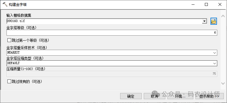 金字塔压缩类型 (可选):构建栅格金字塔时使用的压缩类型。包括DEFAULT、LZ77、JPEG、JPEG_YCbCr、NONE。 -