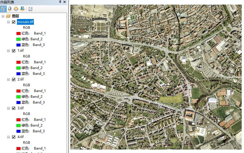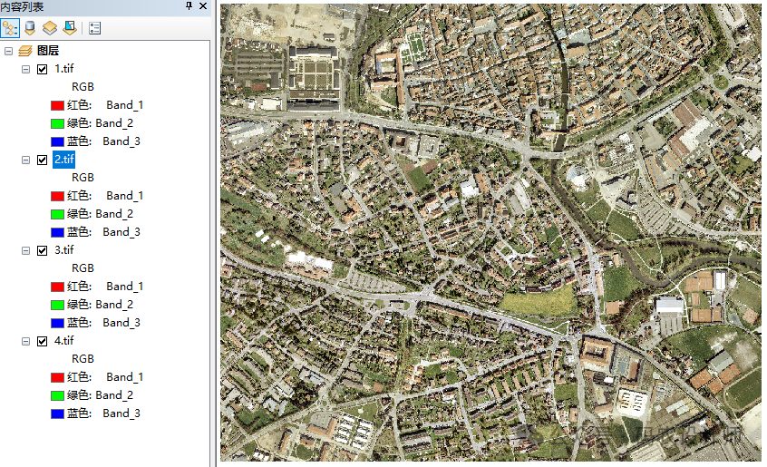加载1.tif】、【2.tif】、3.tif】、4.tif】4张相邻且有重合的卫星影像图。