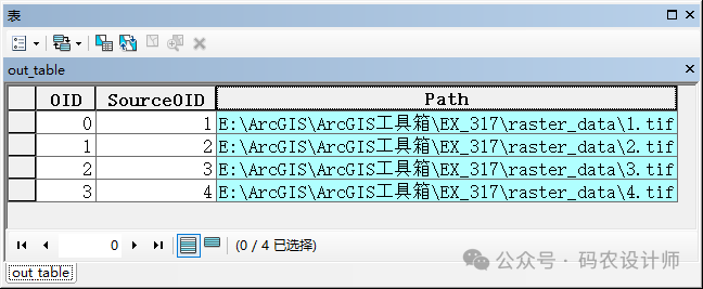 设置完成,点击确定,得到输出表。其中,OID字段是原始栅格目录表中行的 OID,Path字段是非托管栅格目录中包含的栅格数据集的路径。