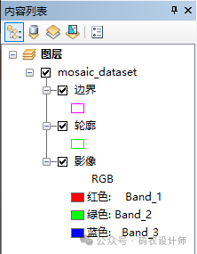• 边界是镶嵌数据集中所有图像数据集的范围,由其轮廓线定义。边界是一个面要素类,用于确定镶嵌数据集的空间范围。
