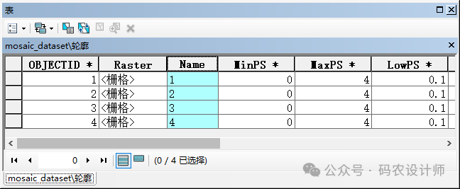 加载【mosaic_dataset】镶嵌数据集。其中,轮廓表示每个栅格数据集的范围,查看其属性表可以看到该镶嵌数据集包含4个栅格数据集。