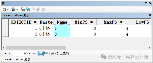 查看轮廓属性表可以看到该镶嵌数据集再删除指定栅格数据集后仅包含2个栅格数据集。