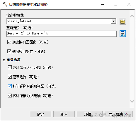 从镶嵌数据集中移除栅格工具用于从镶嵌数据集中移除选定栅格数据集(指定选择或查询)。