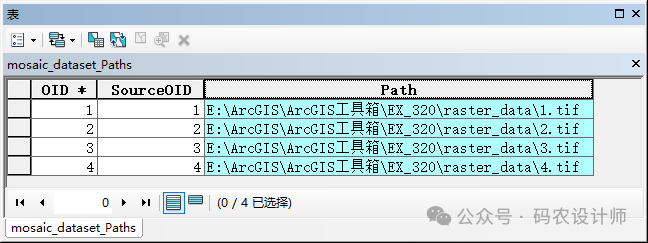 设置完成,点击确定,得到输出表。表中的 SourceOID 字段从原始镶嵌数据集表中行的 OID 中获取,Path字段为从源栅格导出文件路径。