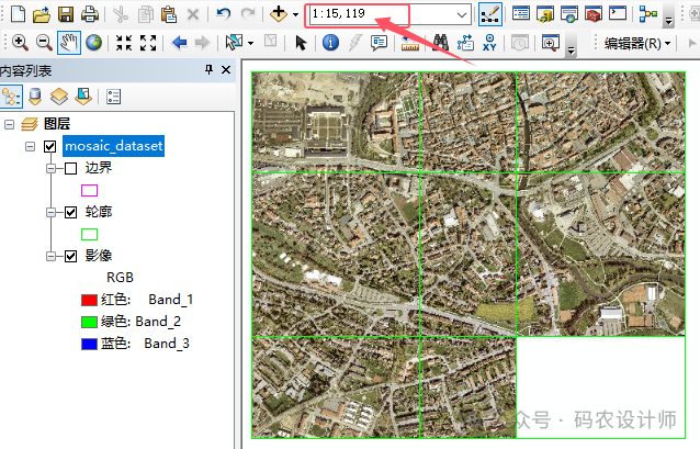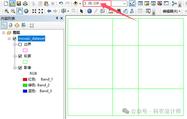 其中,3个栅格数据的MaxPS变为了8,根据【比例 = 像元大小 * 96 / 0.0254】的计算公式,此时显示图像的最大比例为8 * 96 / 0.0254≈30,236.2。因此在1:15,119比例下会显示这3个栅格数据。